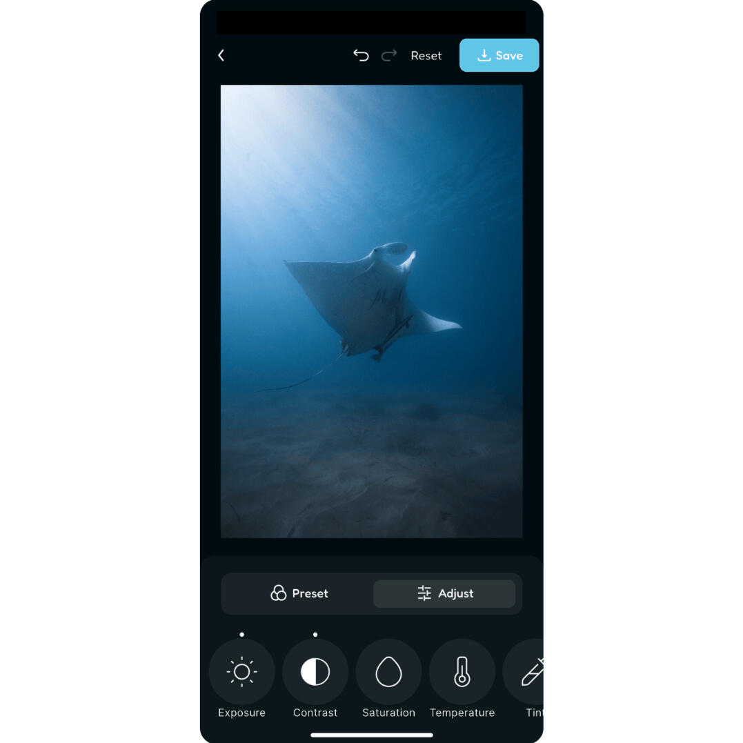 Choose from professionally designed underwater presets made to fix colour and balance.